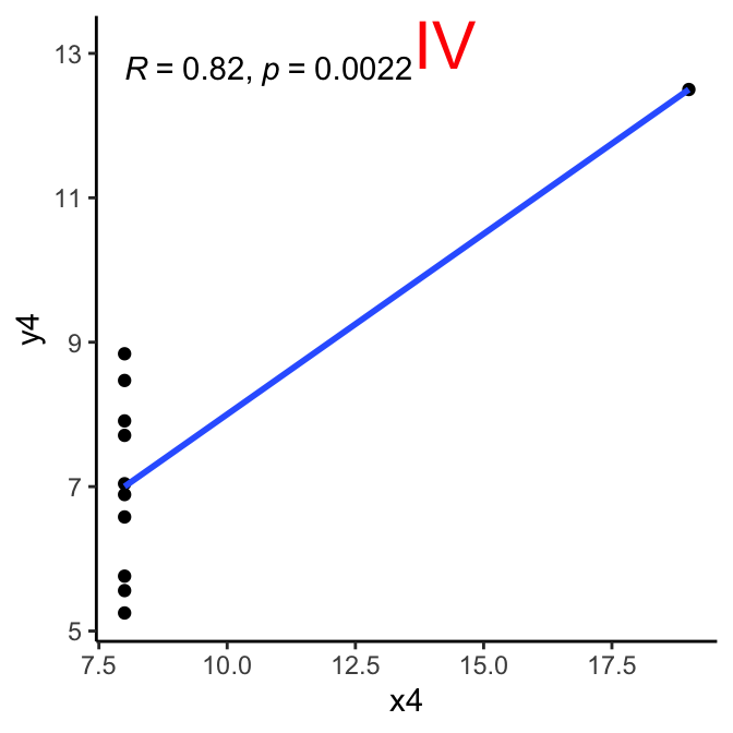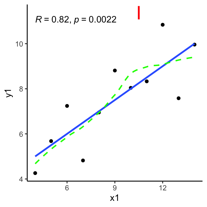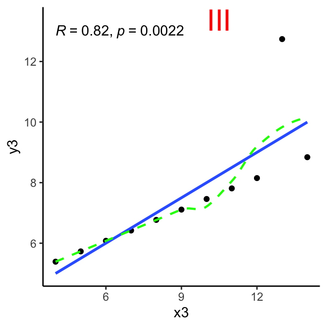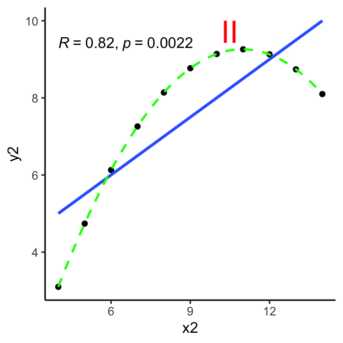 ## put functions hereans_cor <-function(data, x, y, anum) { xe <-enquo(x) # convert var reference ye <-enquo(y) # convert var reference xes <-as.character(xe)[2] # convert to string for use in annotation yes <-as.character(ye)[2] x_lab <-max(data[[xes]])*0.75# set x location for annotation y_lab <-max(data[[yes]]*1.05) # set y location for annotation plot <- data %>%ggplot(aes(x=!!xe, y=!!ye))+geom_point()+geom_smooth(method='lm', se=FALSE)+geom_smooth(method='loess', se=FALSE, color='green', linetype='dashed', size=0.8)+stat_cor()+annotate(geom='text',y=y_lab, x=x_lab, label=anum, size=8, color='red') plot}# run functions to get infoa1 <-ans_cor(data=ans, x=x1, y=y1, anum='I')a2 <-ans_cor(data=ans, x=x2, y=y2, anum='II')a3 <-ans_cor(data=ans, x=x3, y=y3, anum='III')a4 <-ans_cor(data=ans, x=x4, y=y4, anum='IV')