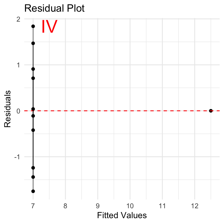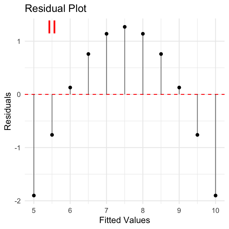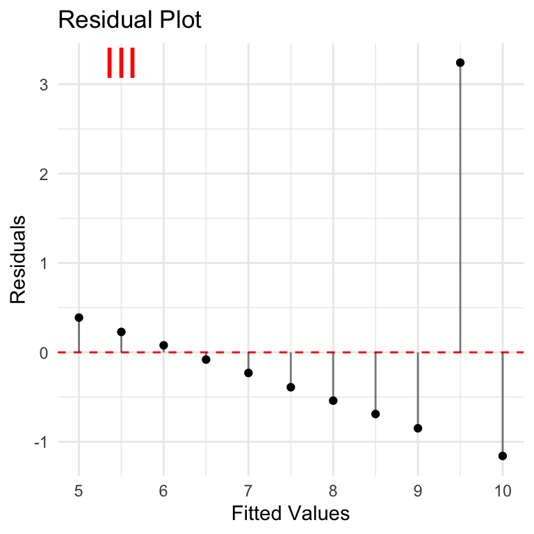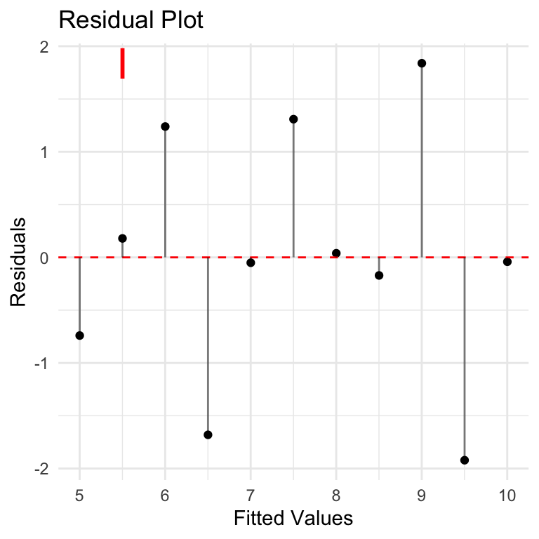 homoScedTest <-function(data, x, y, anum) { xe <-enquo(x) # convert var reference ye <-enquo(y) # convert var reference xes <-as.character(xe)[2] # convert to string for use in annotation yes <-as.character(ye)[2] x_lab <-max(data[[xes]])*0.75# set x location for annotation y_lab <-max(data[[yes]]) # set y location for annotation formula <-paste0(quo_name(ye), " ~ ", quo_name(xe))# calculate model model <-lm(formula, data=data)# add residuals and fitted values to the data for plotting data$residuals <-residuals(model) data$fitted <-fitted(model) x_lab <-min(data$fitted)+0.5 y_lab <-max(data$residuals)## generate plot plot <- data %>%ggplot(aes(x=fitted, y=residuals))+geom_point()+geom_hline(yintercept=0, linetype='dashed', color='red')+geom_segment(aes(xend=fitted, yend=0), alpha=0.5)+annotate(geom='text',y=y_lab, x=x_lab, label=anum, size=8, color='red')+labs(x='Fitted Values', y='Residuals', title='Residual Plot')+theme_minimal()# Breusch-Pagan test for homoscedasticity bpt_results <-bptest(model)# put results in table bpt_row <-data.frame(case=anum, BP_statistic=bpt_results$statistic, p_value=bpt_results$p.value)row.names(bpt_row) <- anum bpt_row <- bpt_row %>%mutate(conclusion=ifelse(p_value>0.05,"Homoscedasticity: null hypothesis holds.","Homoscedasticity issues: null hypotheis fails.") )# return results from plot and BP testlist(plot=plot, bpt=bpt_results,bpt_row=bpt_row)}#anss <- homoScedTest(ans, x1, y1, 'I')#anss$plot#anss$bpt