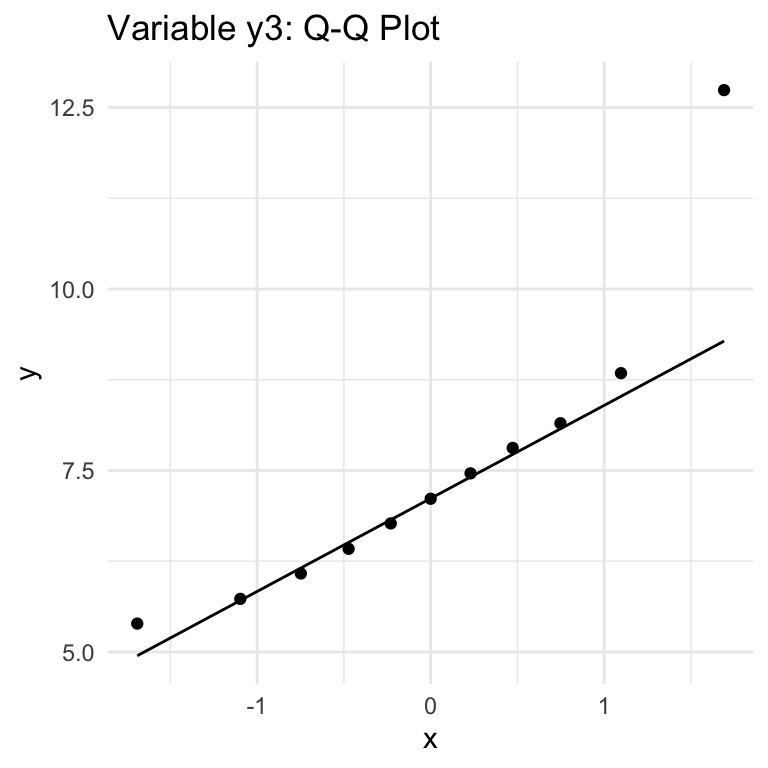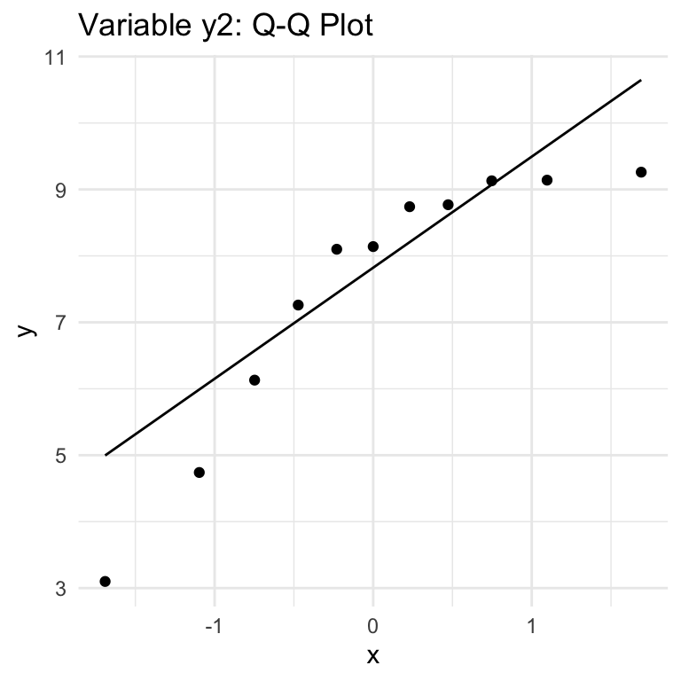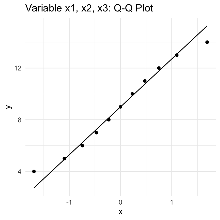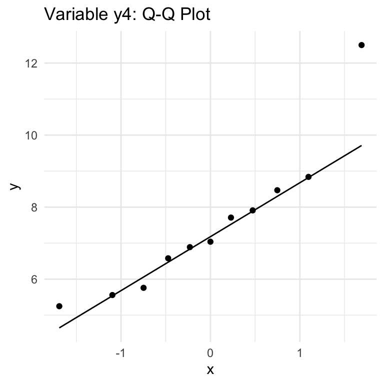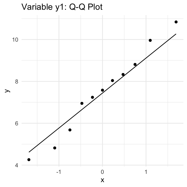 # first 3 vars are samenorm_01 <-normalTest(data=ans, var=x1, vars=c('x1','x2','x3'))norm_04 <-normalTest(data=ans, var=x4, vars=c('x4'))norm_01a <-normalTest(data=ans, var=y1, vars=c('y1'))norm_02a <-normalTest(data=ans, var=y2, vars='y2')norm_03a <-normalTest(data=ans, var=y3, vars='y3')norm_04a <-normalTest(data=ans, var=y4, vars='y4')