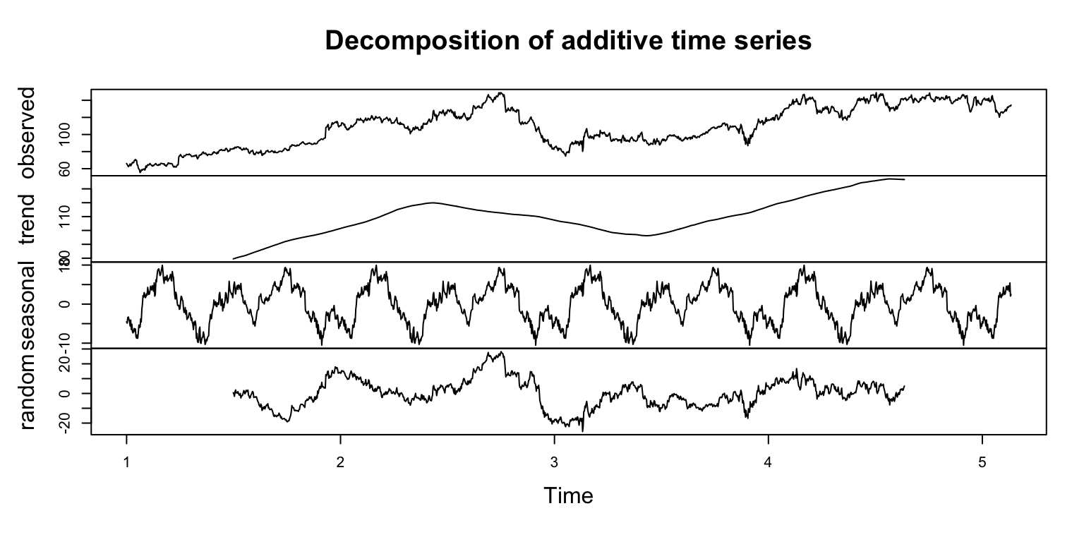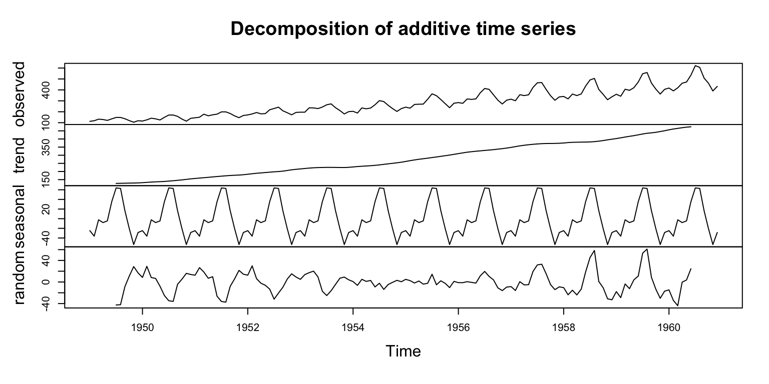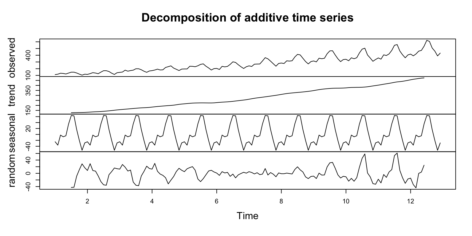 Forecasting: time series objects are designed for applying various forecasting methods like Holt-Winters and ARIMA. This is well beyond the scope of this post, but we’ll show a quick ARIMA example.