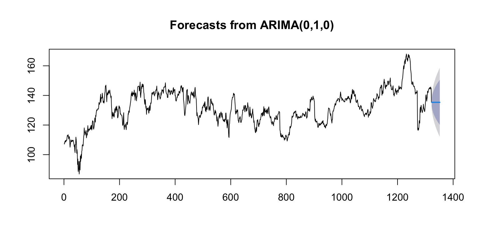 library(forecast)## get closing prices for forecastingprice_cl <- price[,4]## get a model for the time series - using auto.arima for simplicityfitA <-auto.arima(price_cl, seasonal=FALSE) ## can add trace=TRUE to see comparison of different models ## show modelfitA