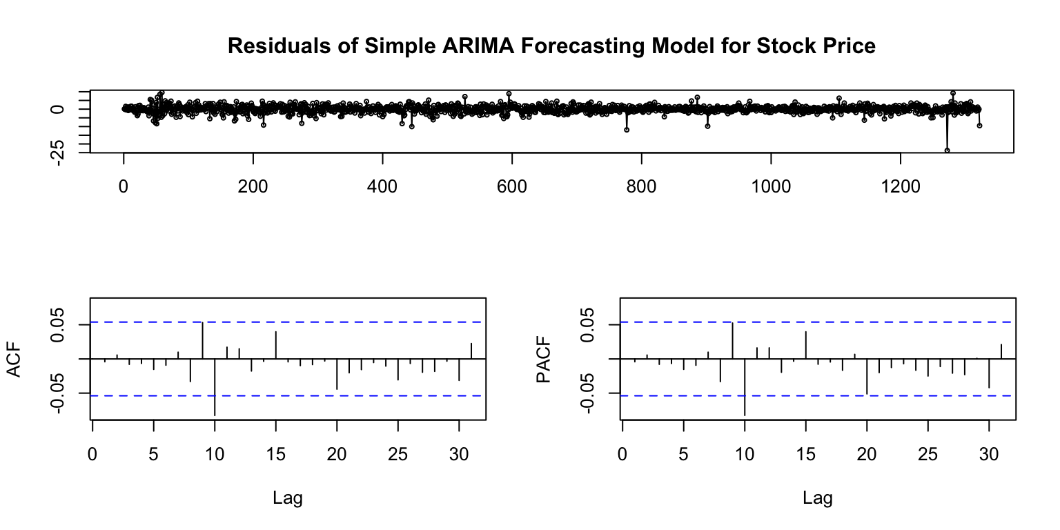 ## check residualstsdisplay(residuals(fitA), main='Residuals of Simple ARIMA Forecasting Model for Stock Price')
