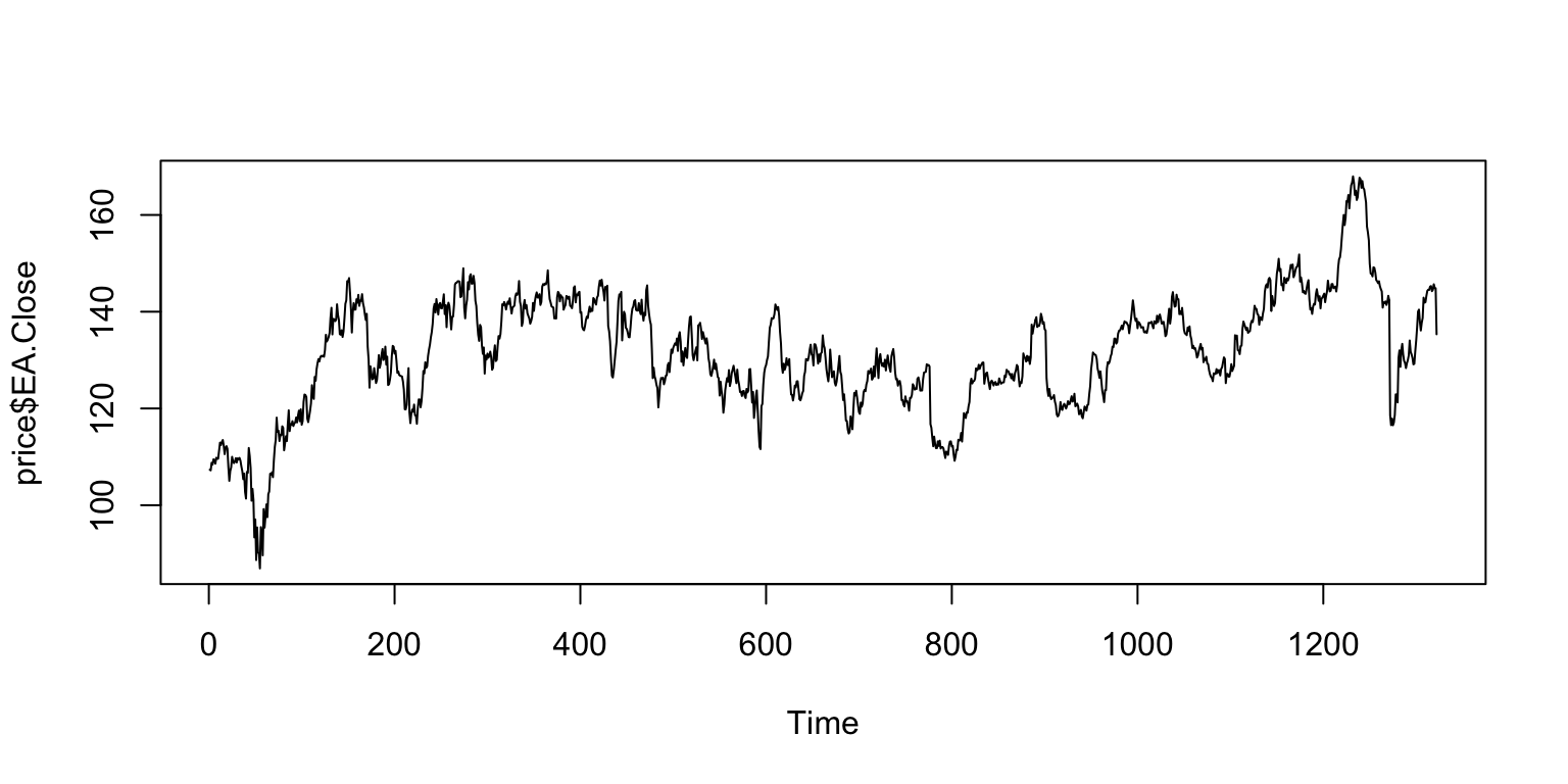 library(quantmod)## use quantmod pkg to get some stock prices as time seriesprice <-getSymbols(Symbols='EA', from="2020-01-01", to=Sys.Date(), auto.assign=FALSE)class(price)